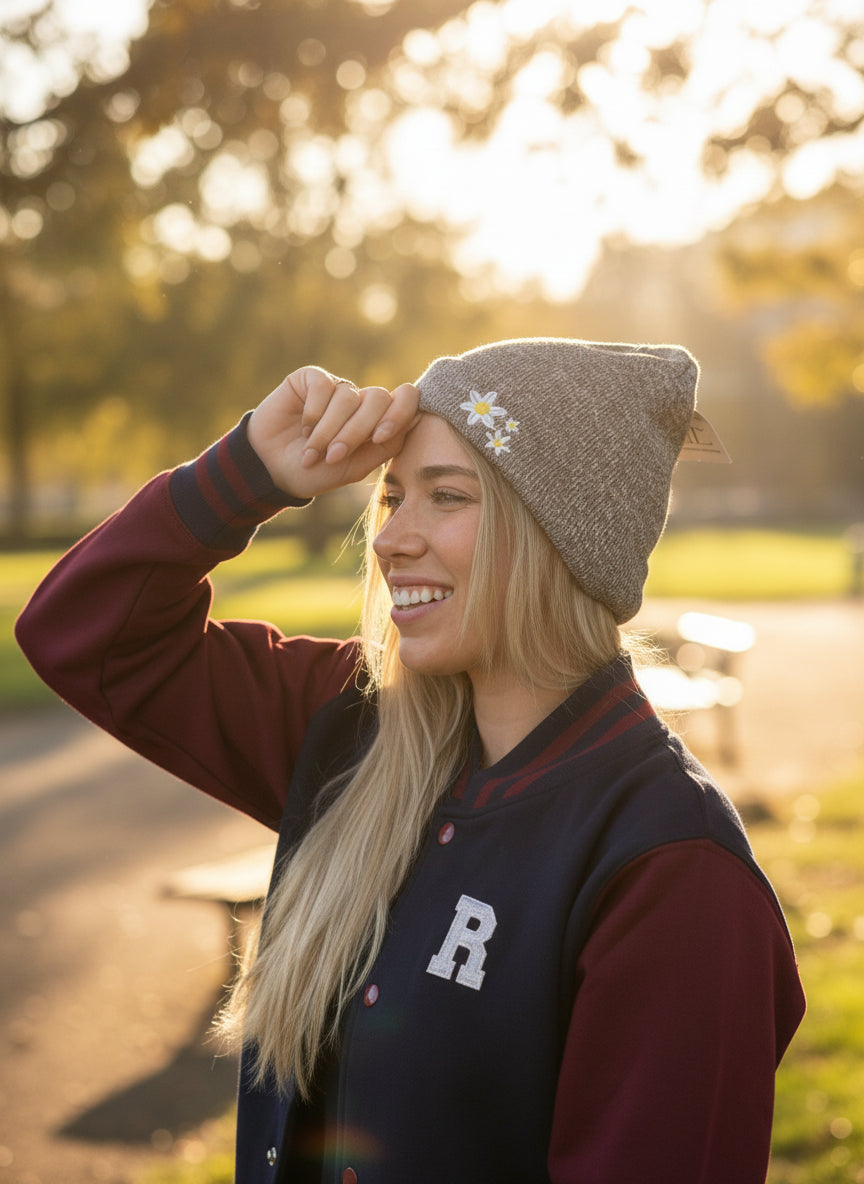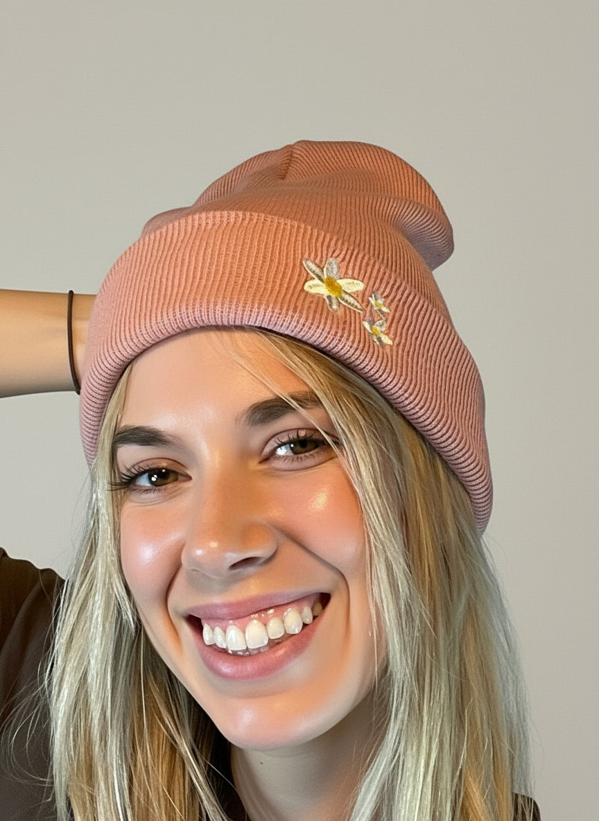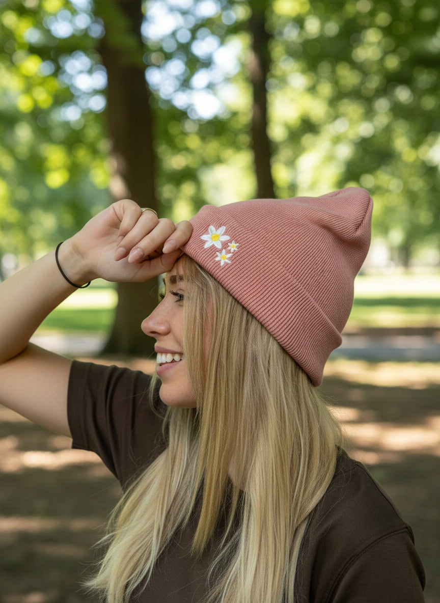 Mit unserer exklusiven 3-Gänseblümchen-Mütze bleiben Sie stilvoll warm. Drei zarte Gänseblümchen zieren die rechte Vorderseite. Die Mütze ist aus weichem, hochwertigem Material gefertigt und bietet höchsten Tragekomfort. Sie ist für Erwachsene geeignet und in den Farben Schokoladenbraun , Lavendel, Altrosa und Hellgrau erhältlich. Perfekt als stylisches Accessoire für jeden Tag oder als liebevolles Geschenk.